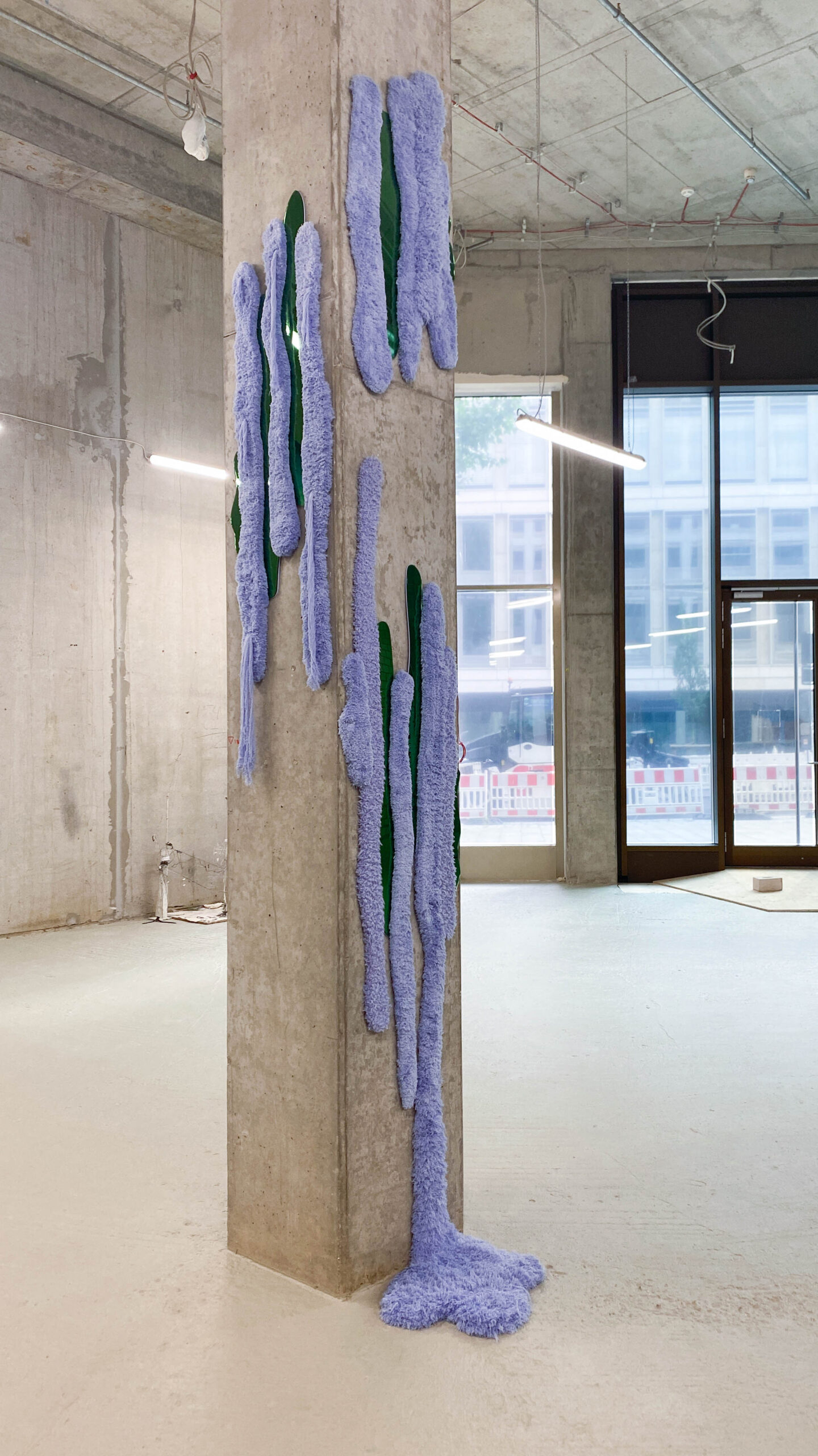 Elham, Maha, and Yara challenge the boundaries between wall and floor with their fluid, striped structures. Elham, in particular, seems to dissolve into the space—its woolen extension spreads across the floor like a shimmering puddle. The green mirror reflects light and movement, while the soft lilac-blue brings balance. Each piece stands on its own, yet together they create a unique dynamic. A digital inspiration transformed into tangible materiality—where does the boundary lie?